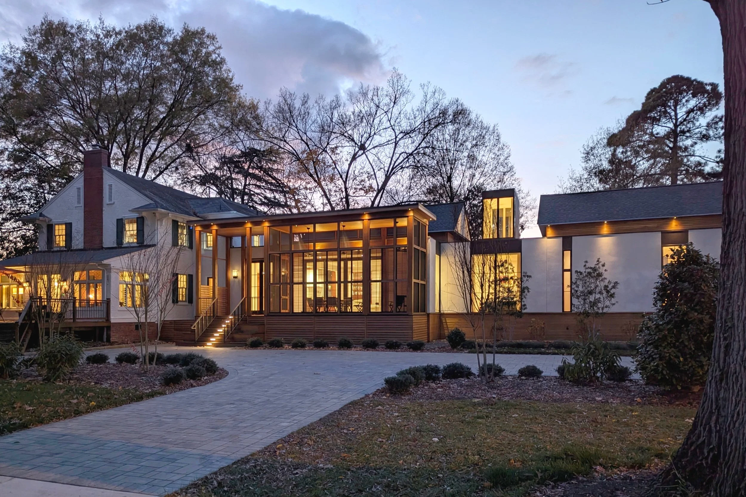 This classic center-hall house, built in 1926, occupies a corner lot in Richmond’s Laburnum Park Historic District. In designing a rear expansion for the longtime owners, we reinterpreted and modernized traditional elements of a classic Southern house: an expansive east-facing louvered porch with cross ventilation and a 14-foot-tall ceiling, a lantern-like glass belvedere set like a sentry between a pair of twin gables, and tall floor-mounted tripartite windows. Timeless and natural materials of cedar and traditional hand-rubbed lime-based stucco plaster clad the exterior.
